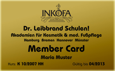 Mit Abschluß der kosmetischen und fußpflegerischen Berufsausbildung an einer INKOFA-Schule erhält jede(r) Teilnehmer-in die INKOFA-CARD, die nicht nur für die Dauer der Berufsausbildung, sondern für weitere 5 Jahre danach erhebliche Gebührenermäßigungen für viele an den INKOFA Dr. Leibbrand Schulen durchgeführten Ausbildungen sowie eine individuelle Beratung und Betreuung - Coaching - in allen Berufsfragen (ob in angestellter oder selbständiger Position) garantiert. Mit der INKOFA-Card können unsere Schülerinnen zusätzlich an den regelmäßig kostenlos an den INKOFA Dr. Leibbrand Schulen stattfindenden Fachveranstaltungen zu aktuellen Themen der Kosmetik teilnehmen.